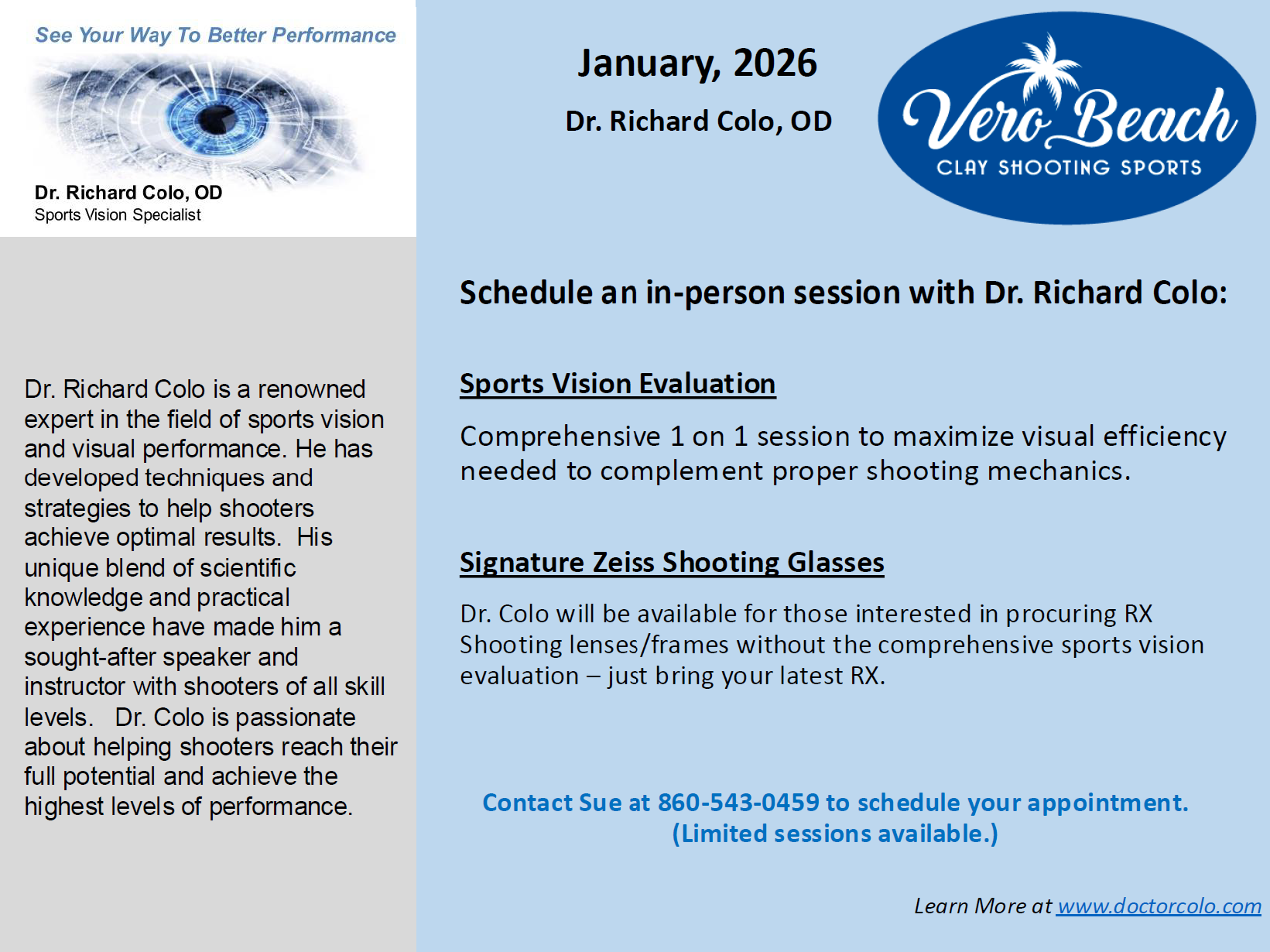 In the 46 years that Dr. Colo has been in practice in CT, he has created a unique specialty niche related to shooting that has drawn both national and international shooters to his practice. Rich has developed a system of dominance evaluation that has been accepted as the benchmark among some of the nation’s top instructors. His role is not that of shooting instructor; rather, it is to maximize the visual efficiency needed to complement proper shooting mechanics. His passion for his profession and favorite avocation are infectious to all who seek his counsel.